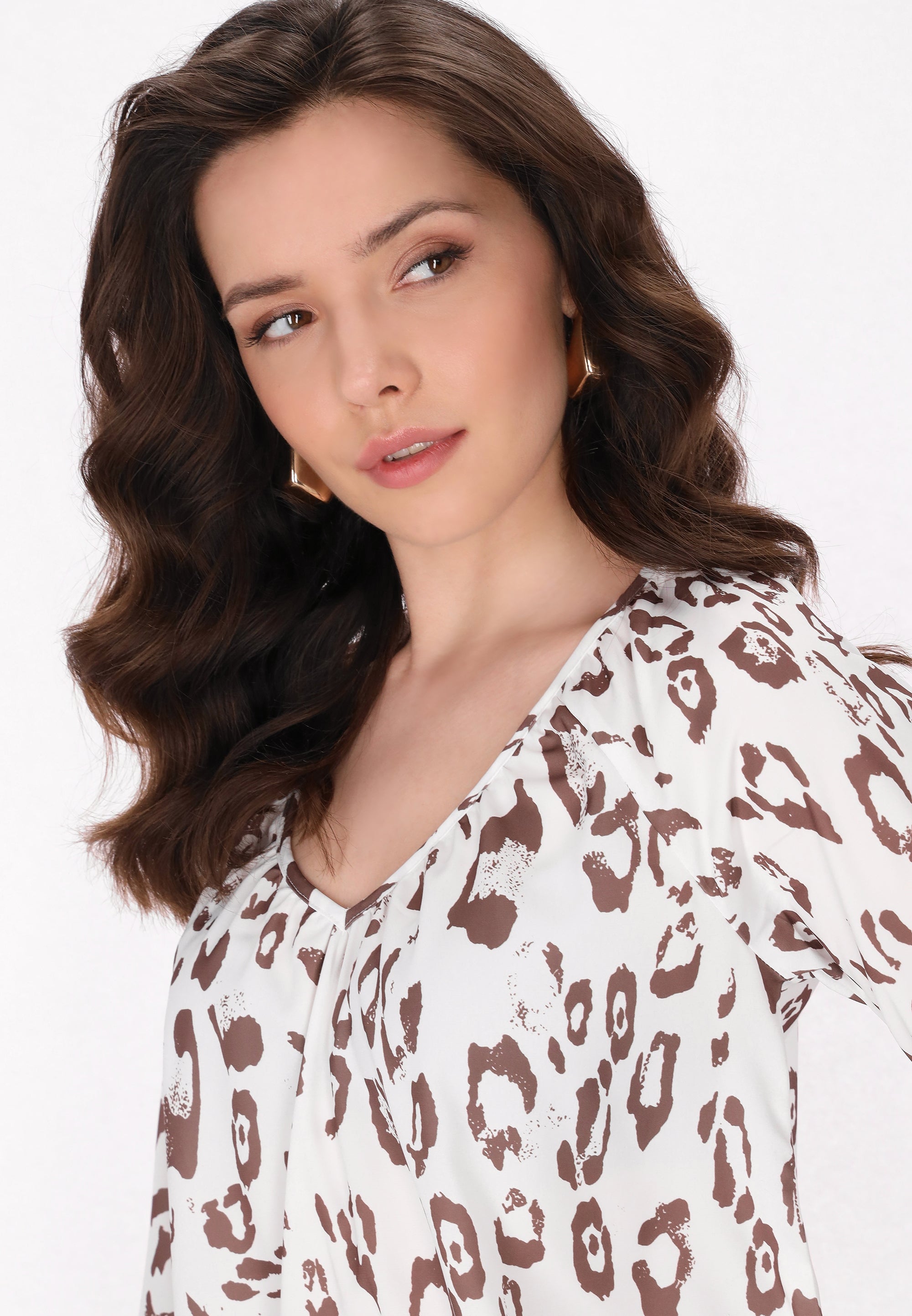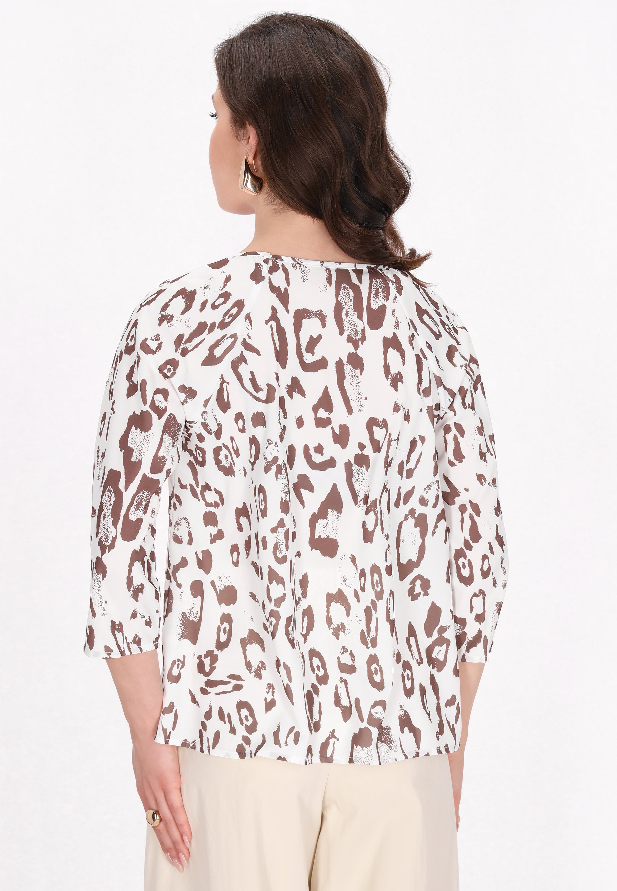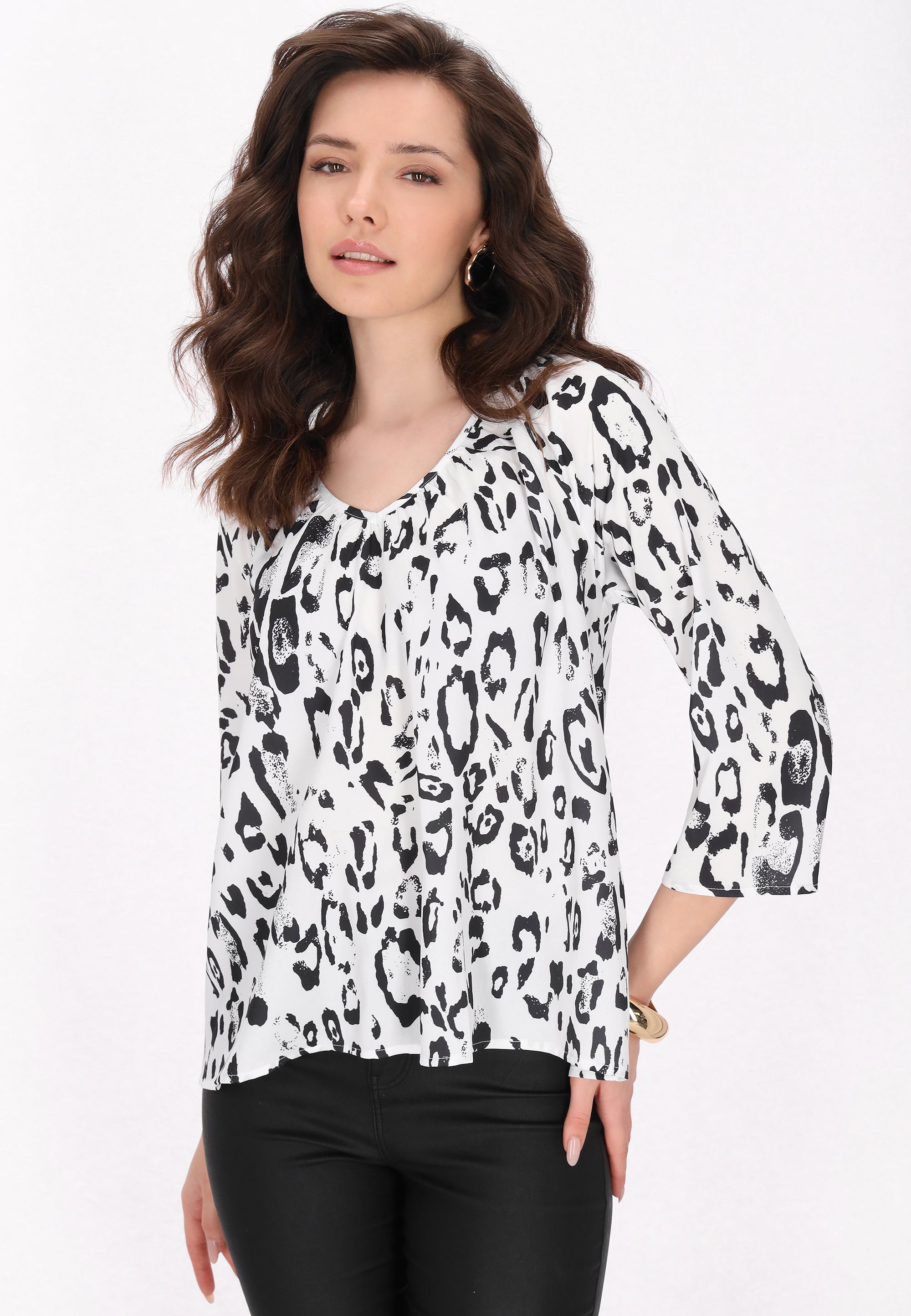 Embrace effortless style with this chic blouse, featuring a relaxed fit and a flattering V-neckline. The 3/4-length lantern sleeves with elastic cuffs and lightweight woven fabric offer an airy feel, perfect for casual outings. Adorned with a striking leopard print, this blouse is an ideal choice for fashion lovers looking to elevate their everyday wardrobe with a touch of chic flair from the Fashion Look Collection.