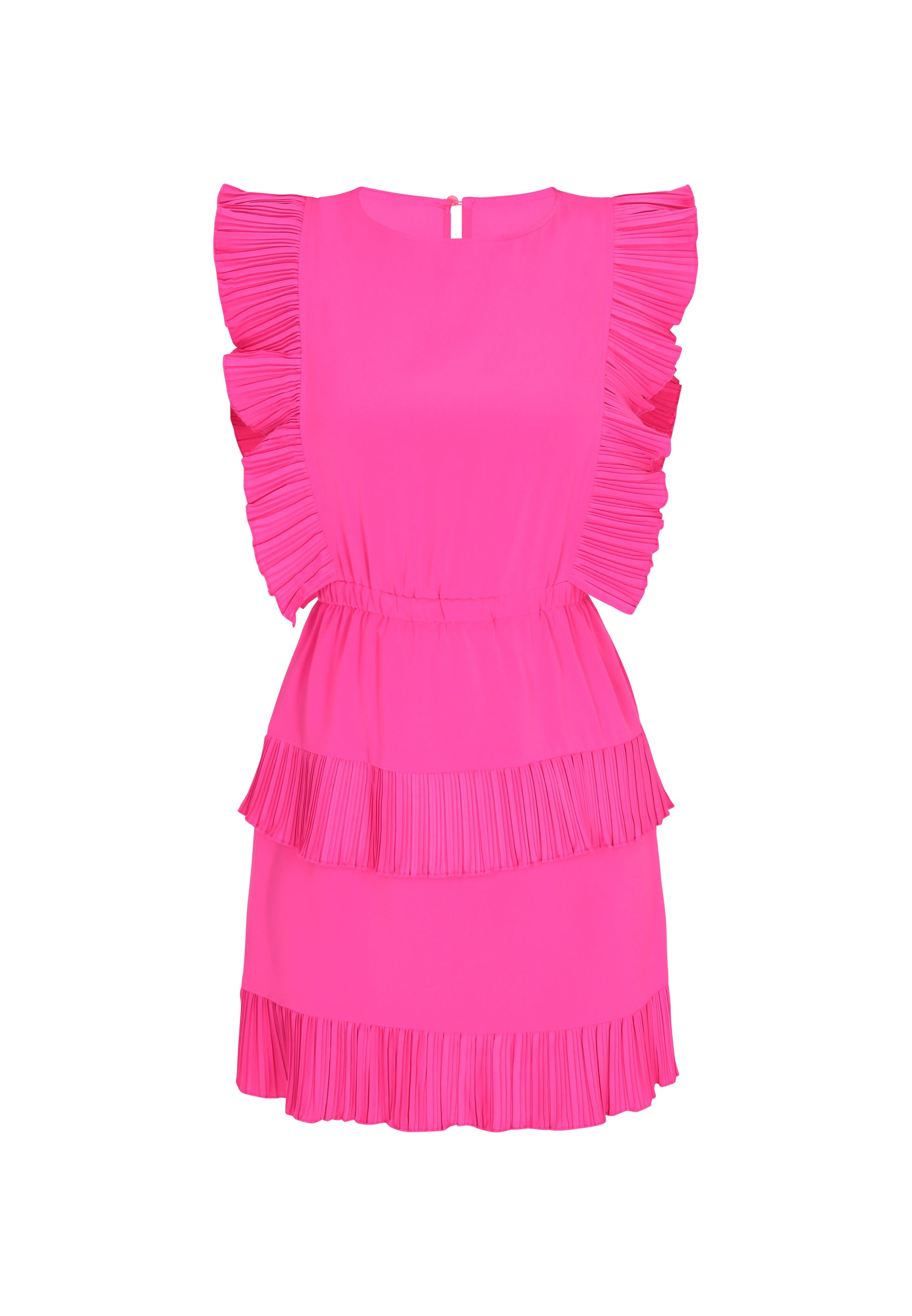 Keyword: dress, elastic waist, everyday fashion, fashion look collection, fashion lover, mini, plain, pleats, regular fit, romantic style, round neck, ruffles, sleeveless, tiered, trendy, woven