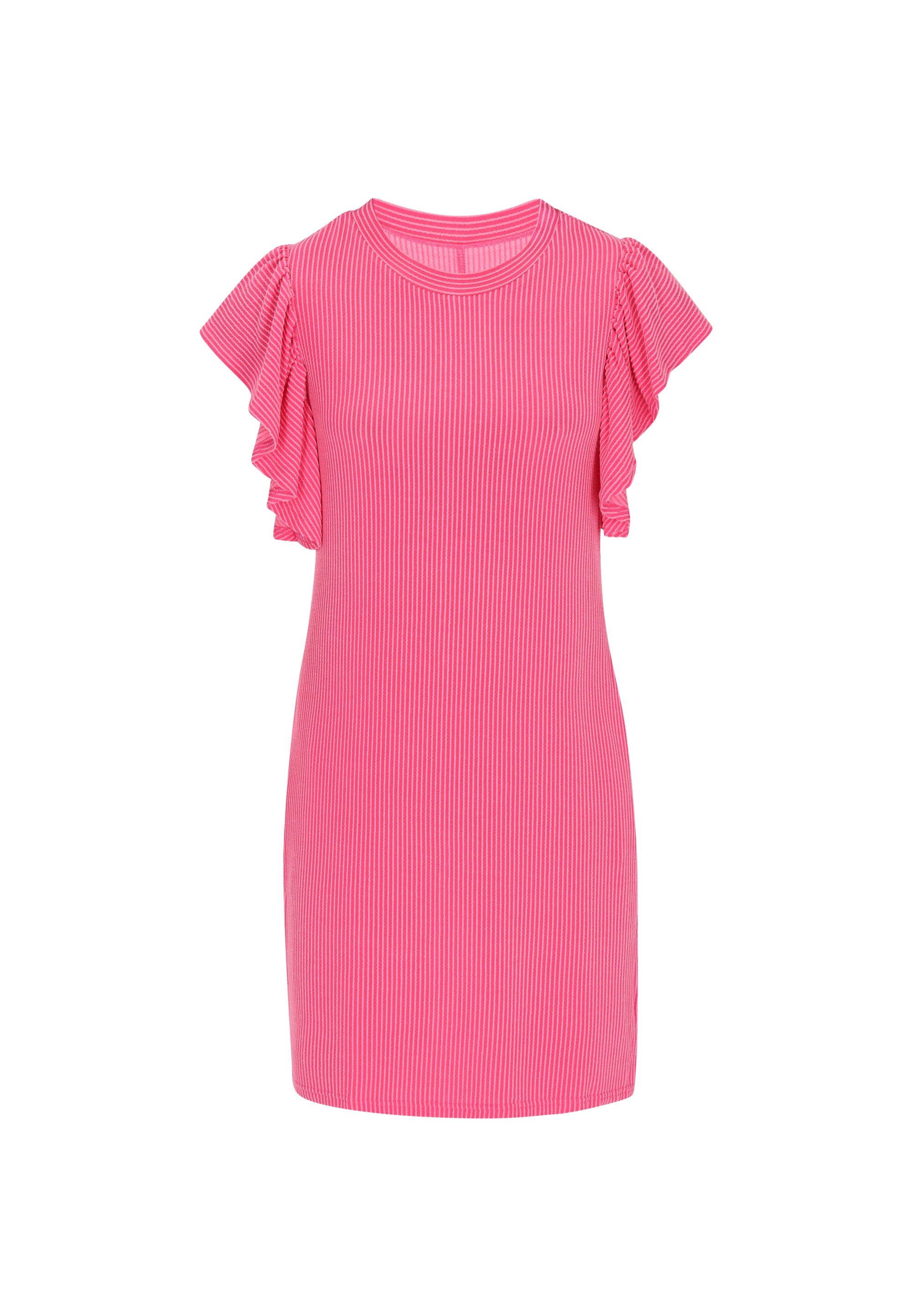 Step into style with this captivating dress featuring a regular fit and mini length. The round neck and cap sleeves are beautifully enhanced by ruffled details, infusing a playful vibe. Made from soft knitted fabric adorned with a stripes pattern, its the perfect choice for casual everyday fashion lovers seeking a chic look in the Fashion Look Collection.