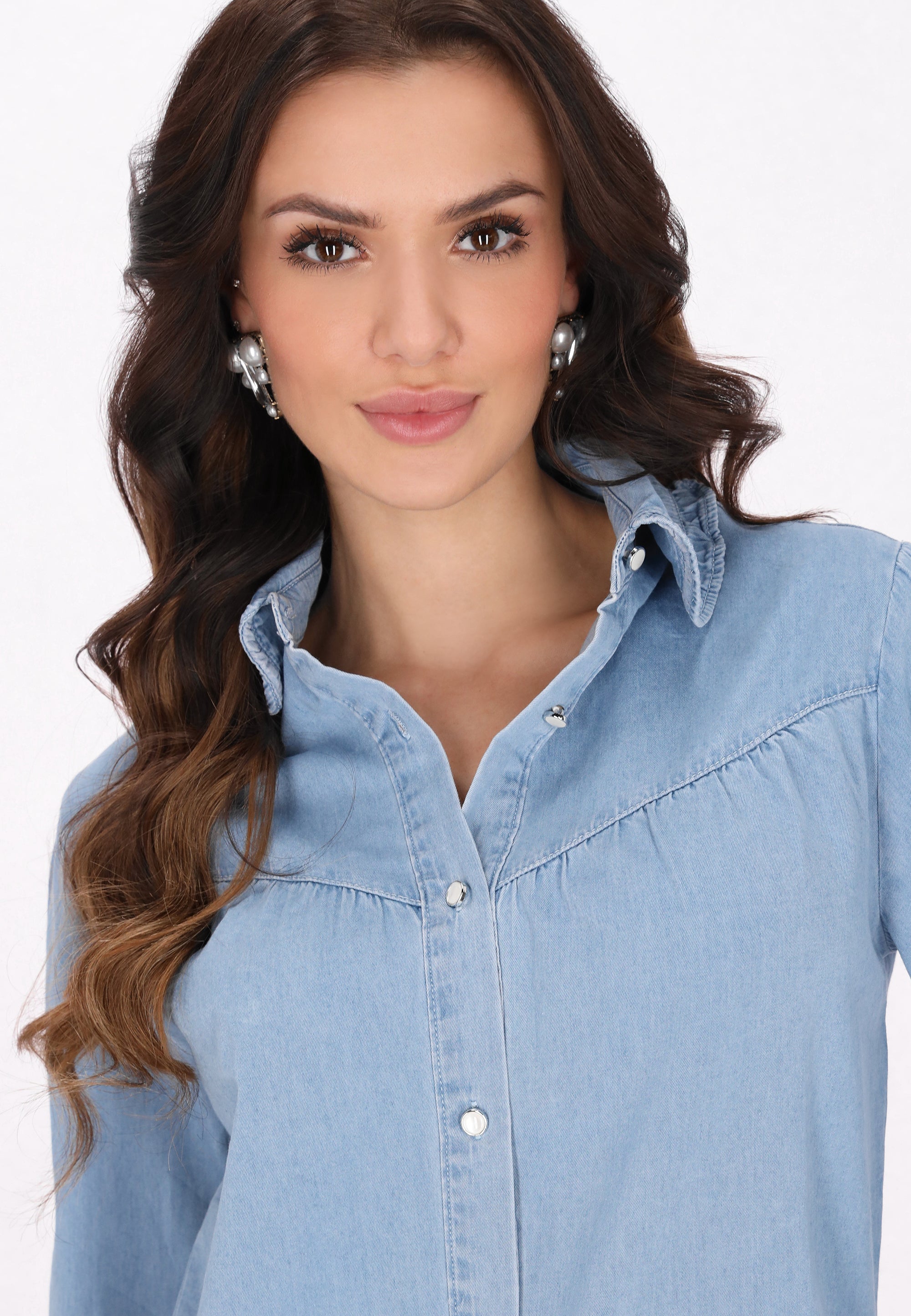 A stylish button-down shirt is the perfect choice for everyday styling. The classic cut provides comfort and freedom of movement, while the rounded collar and cuffs with a delicate frill add a subtle, feminine touch. Slightly wrinkled fabric adds texture and casualness, perfectly matching the climate of casual fashion. A model from the Fashion Look Collection, created for lovers of comfort and style in one.
